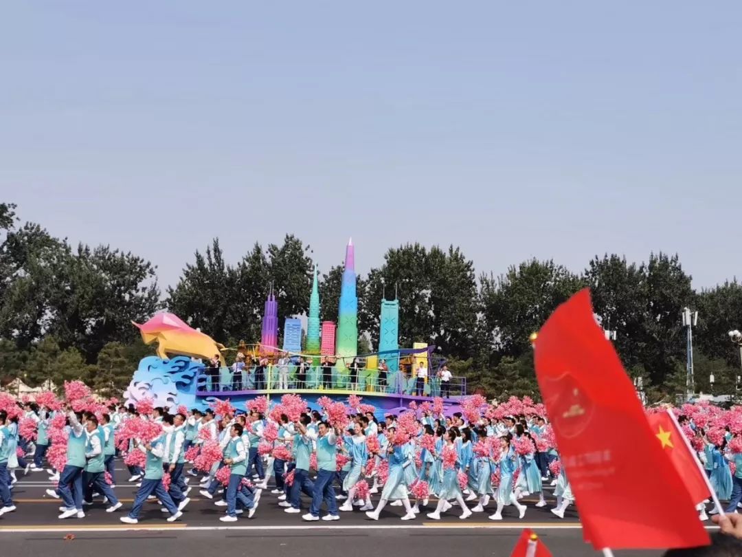 作为群众游行活动三个篇章之“伟大复兴”的开端,由北辰集团参与的“创新驱动”方阵紧随习近平总书记巨幅画像,伴随着《时代号子》的嘹亮歌声,自信昂扬的走过天安门。“天宫”奔月、“蛟龙”探海、“天眼”探空、“北斗”组网、C919大飞机首飞......搭载着无数大国重器,三辆彩车首尾相连,组成高速飞驰的复兴号,象征着今天的中国驰骋在科技强国的征途上。队员们身着制服,挥舞着手中“银光闪闪”的帽子,高唱着“力量攥在手,梦想在前头......”,充分传达了“自由、生动、欢愉、活泼”的情感表达,整个方针化成一片欢乐的海洋,向全世界展现了新时代科技工作者不懈奋斗、积极向上的精神风貌。