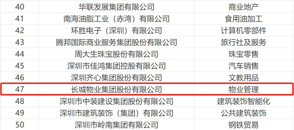 由深圳市行业领袖企业发展促进会与深圳商报&读创共同主办的“2019深圳行业领袖企业100强”评选活动,历经半年时间,“行业领袖企业”100强名单经过报名、专家评审、人气投票等环节已全部产生。本次评选的参选企业覆盖了深圳的绝大多数行业领域,具有广泛的代表性。评选活动邀请了行业专家、新闻媒体、人大代表和政协委员、律师、商协会代表和企业界代表全程参与。行业领袖百强评选流程经过发布、报名、推荐、资料审核、企业调研、初评、人气投票、专家评审环节。长城物业凭借较强的综合实力与品牌知名度,作为物业管理行业唯一一家物业服务企业成功入选“2019深圳行业领袖企业100强”,在百强名单中位列47名。