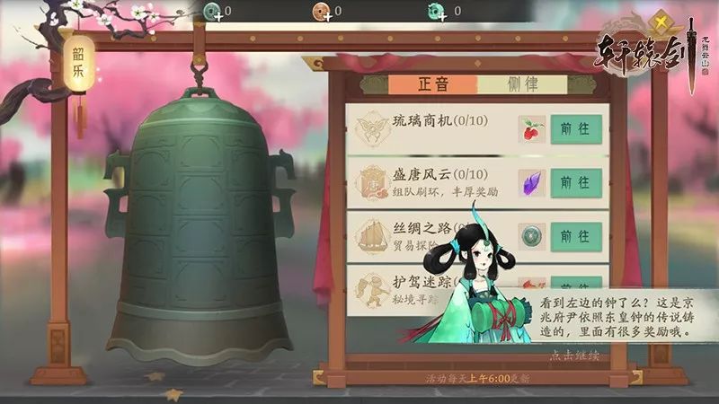 日常任务方面,《轩辕剑龙舞云山》分为正音和侧律两部分,选择任务点击前往会自动寻路,完成任务本身会获得各种奖励。