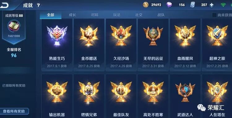 成就系统也是很早就推出的一项荣誉系统,通过玩家在游戏中的精彩表现、过人数据给予一定的奖励,铜牌、银牌和金牌。每提升一级就可以领取100钻石的奖励,另外还有专属的等级奖励,30级的狄仁杰阴阳师皮肤,50级的初级成就头像框以及80级的高级成就头像框都是非常不错的,但往往等级越高越难提升,如果你身边有80级成就的小伙伴,那可以说是很厉害了。