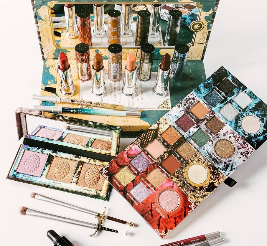 权力的游戏最终季上映时,Urban Decay推出了与其联名的彩妆,产品包括眼影盘、高光盘、唇膏、眼线笔、唇颊两用液与化妆刷,外观和设计都采用了剧中元素。