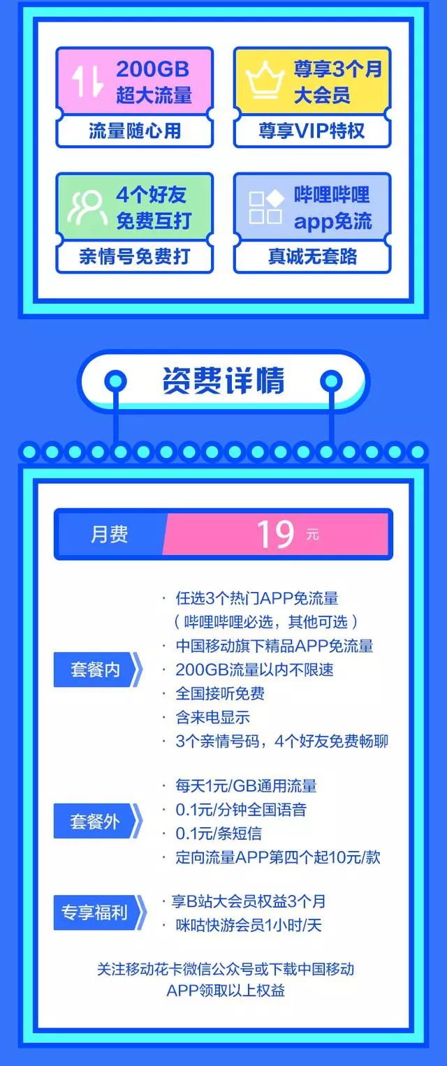 即将到来的携号转网,各大电信运营商都展开了最后的「抢客大战」。这不,近日中国移动就推出了移动花卡B站版,打算效仿大王卡的模式吸引新用户。据POPPUR了解,移动花卡B站版是一款主打高流量的互联网套餐,每月资费为19月,套餐内可享中国移动旗下精品APP免流量,全国接听免费、含来电显示、3个亲情号码与4个好友免费畅聊。激活后可选择3个热门APP免流量(哔哩哔哩必选,其他可选APP如下)。套餐外全国语音通话0.1/分钟,短信0.1元/条。套餐外流量每天1元/GB通用流量,定向流量APP第四个起10元/款(可选APP如下)。