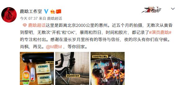 鹿哥乘车离开时,还摇下车窗跟在外等候了十几个小时的小芦们打招呼,熟悉的双手合十,你的温柔,你的感谢,我们都收到了。工作室发的杀青微博里也特意提到了守候的芦苇,“感谢在漫长岁月里所有的等待与信任,夜的尽头有你们在守候”。