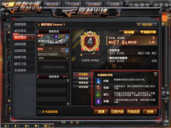 新版本还增加了每周属性系统。这个系统指的是,在每周一刷新的挑战中,不同的挑战难度将搭配有1-4个不同的属性,为挑战玩法增加丰富的变化。除此之外,CFer每周完成挑战任务还将获得不同的对应奖励!