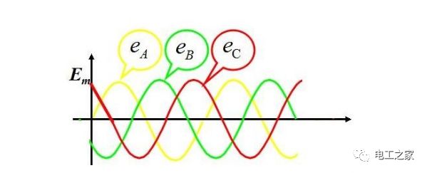 这三个电动势的最大值和频率虽然相同,但是它们的相位并不相同。由于三个线圈平面互成120度角,所以三个电动势的相位互差120度。