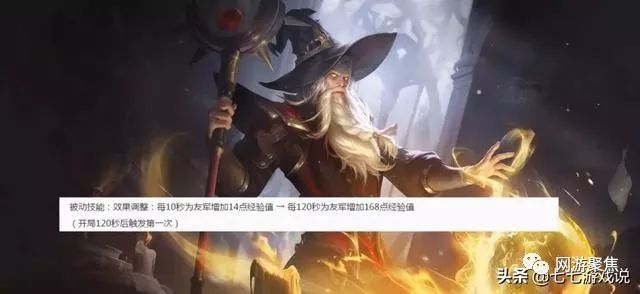 姜子牙削弱,被动效果从10秒增加14点经验值变成120秒增加168点经验值,虽然提升的经验没变化,但是增长间隔大幅变长。对于姜子牙来说,前期的节奏能力降低,等级优势荡然无存。