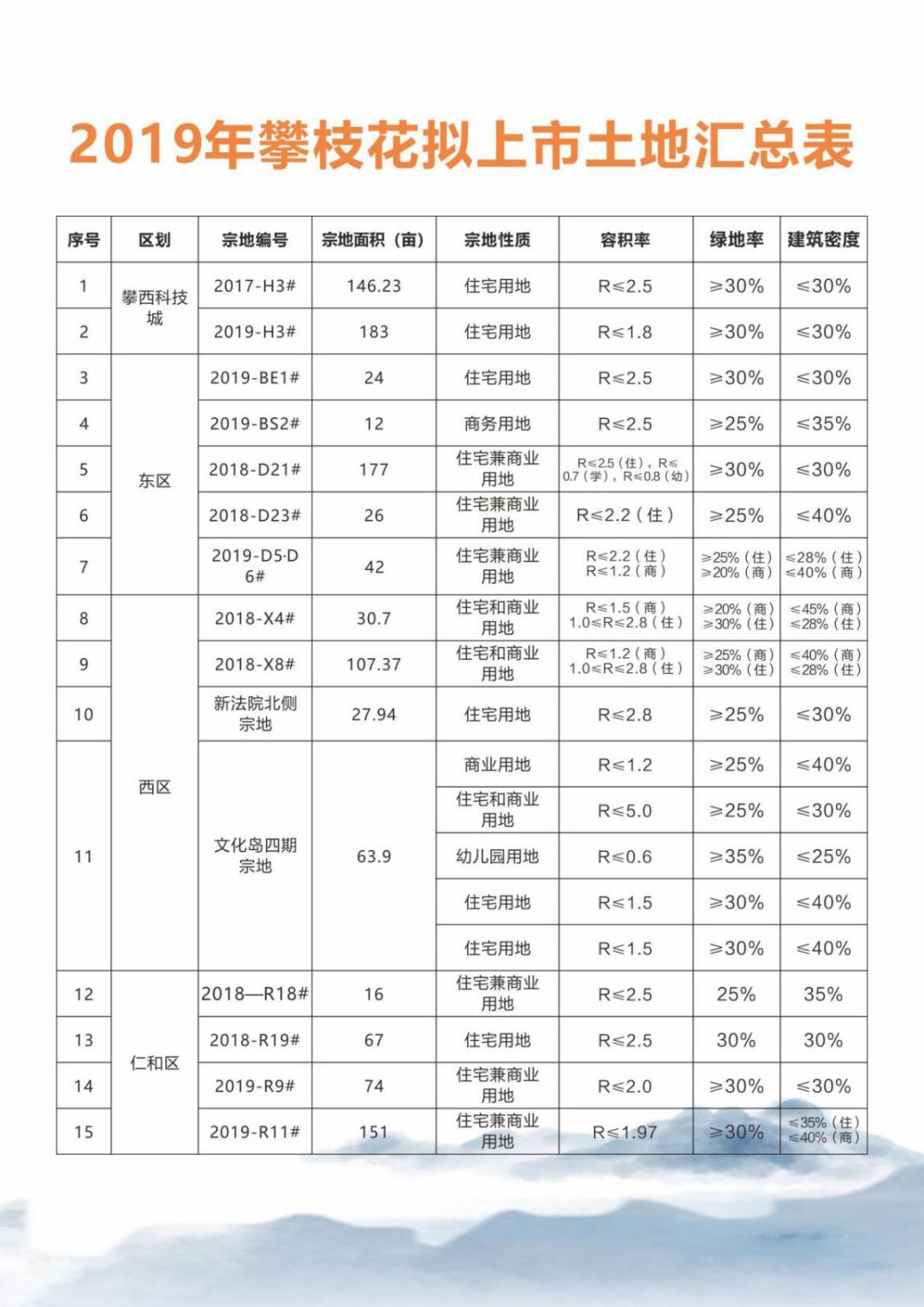 当前,四川攀枝花正处在转型发展、创新发展、跨越发展的关键期,新要求、新征程、新机遇,必将使攀枝花的发展环境更加优化、发展动能更加强劲、发展空间更加广阔。攀枝花也将始终保持开发的姿态,欢迎每一位企业家选择攀枝花、投资攀枝花,与攀枝花共荣双赢,共谱美好未来!攀枝花将以“无门槛入驻、‘保姆’式服务”专业精神和一流的环境、一流的水平、一流的保障,倾力帮助企业做实做优、做大做强。 攀枝花市2019年拟上市部分优质地块: