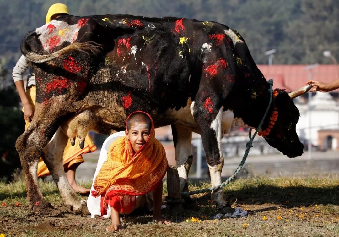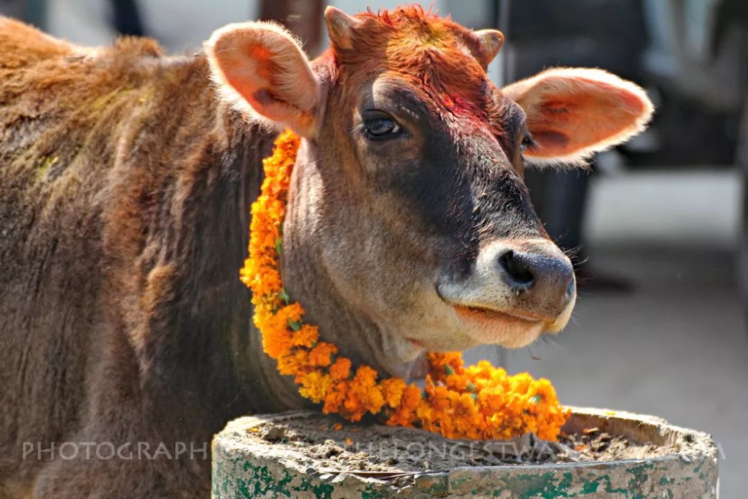 人们在礼敬乳牛时,先用手触摸一下牛的额头,对着牛角叩拜,然后从牛腹底下爬过去,把据说能够防灾祛病的黄色圣线系于牛尾,借以求助财富女神保佑。