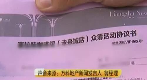 于女士2014年来到万科地产所在的楼盘看房子,看房期间于女士参与了售楼部组织的一场众筹活动。这里即将筹建的咖啡店是开发商旗下的一个品牌,开发商在宣传购房政策时提到,在这家“塞拉味”咖啡店交1万元众筹金,购房款可抵3万,并且成为这家咖啡店的荣誉店长,3年内每天可以喝到一杯免费的咖啡。同时,开发商也承诺,如果客户没有买到这里的房子,这1万元的众筹金可以有两个去处,一是退给当事人,二是保留众筹者在这家咖啡店“荣誉店长”的身份,依旧可以免费喝3年的咖啡。