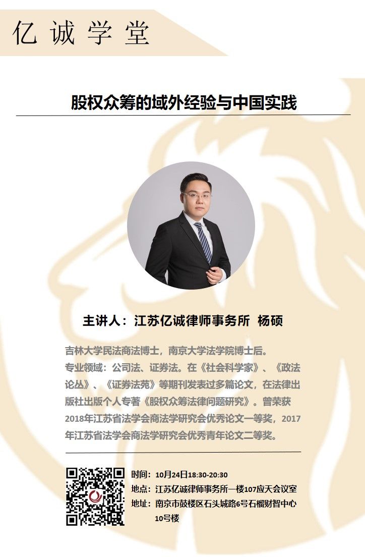 2019年10月24日晚,江苏亿诚律师事务所亿诚学堂如期举办。本期亿诚学堂邀请了杨硕博士讲授“股权众筹的域外经验与中国实践”课程。