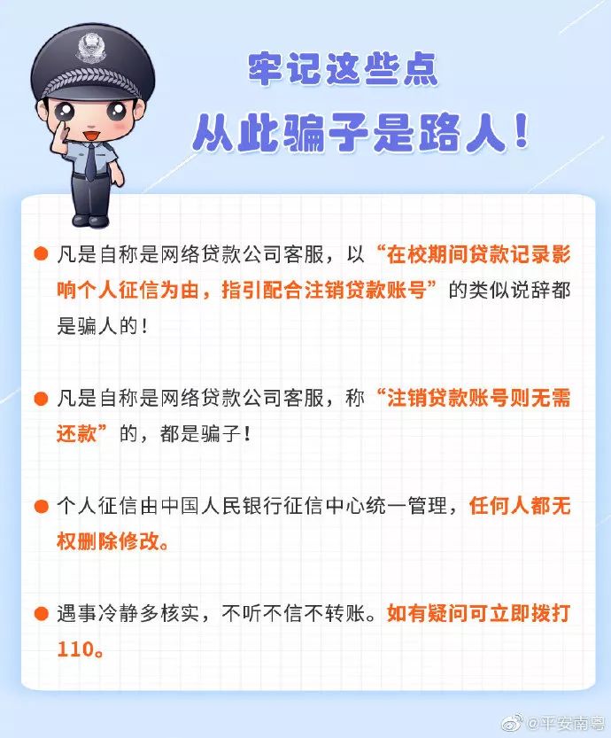 诈骗说辞 ? “在校期间曾注册网贷平台或有贷款记录的,根据国家相关政策需要配合注销账号,否则就会影响个人征信”;