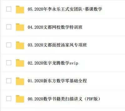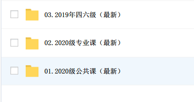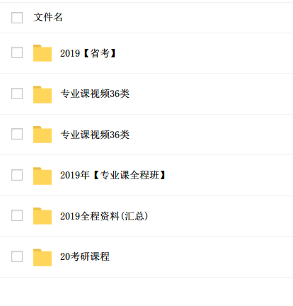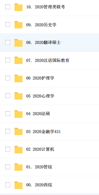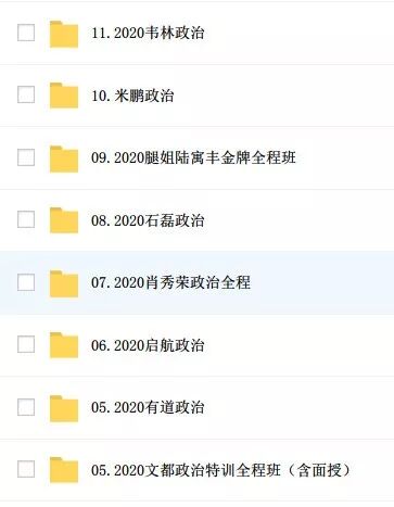 2、新的资源会优先在云群更新,公众号更新较云群会有一定延迟;3、平台部分高端资源将仅在云群更新;4、云群全程更新(到考试初试结束、附赠复试课程),机构面授和网课都会更新。云群文件夹云群主要包含以下几个文件夹:1、【2021公共课全程】(更新中)此文件夹陆续更新20考研基础、强化、突破、冲刺、点晴、考前密押考研全程课程。明年还将更新20考研的复试相关课程。自动更新后续资源2、【2020考研公共课】(更新中)此文件夹为19考研全套公共课资源,供大家随时进行课程的学习,对比,和参考。3、【2020各统考类专业课】(更新中)此文件夹包括西综、管联、中医综合、计算机、金融学431、法硕、心理学、护理学、汉语国际教育、翻译硕士、历史学、管理类联考、经济类联考、教育学311、教育学333、新闻与传播、药学综合等各类专业课。4、【2019年四六级考试课程】此课程为增值课程。5、各地省考、教师资格证资料等