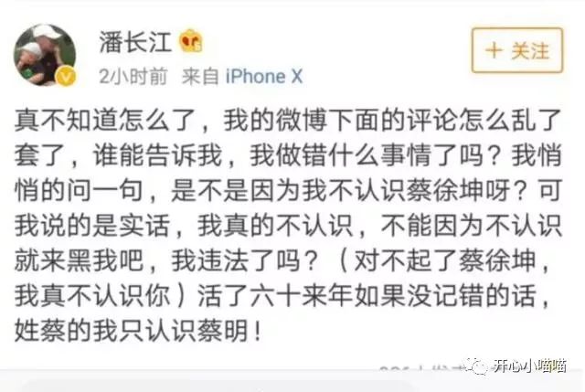 著名小品演员潘长江老师在某综艺节目中说不认识蔡徐坤是谁,这件事一出蔡徐坤粉丝立即攻陷了潘老师的微博,发一些不好的言论来攻击潘老师,对此潘长江老师发微博称不能不认识蔡徐坤就黑我吧,姓蔡的只认识蔡明,并奉劝大家要理智追星!