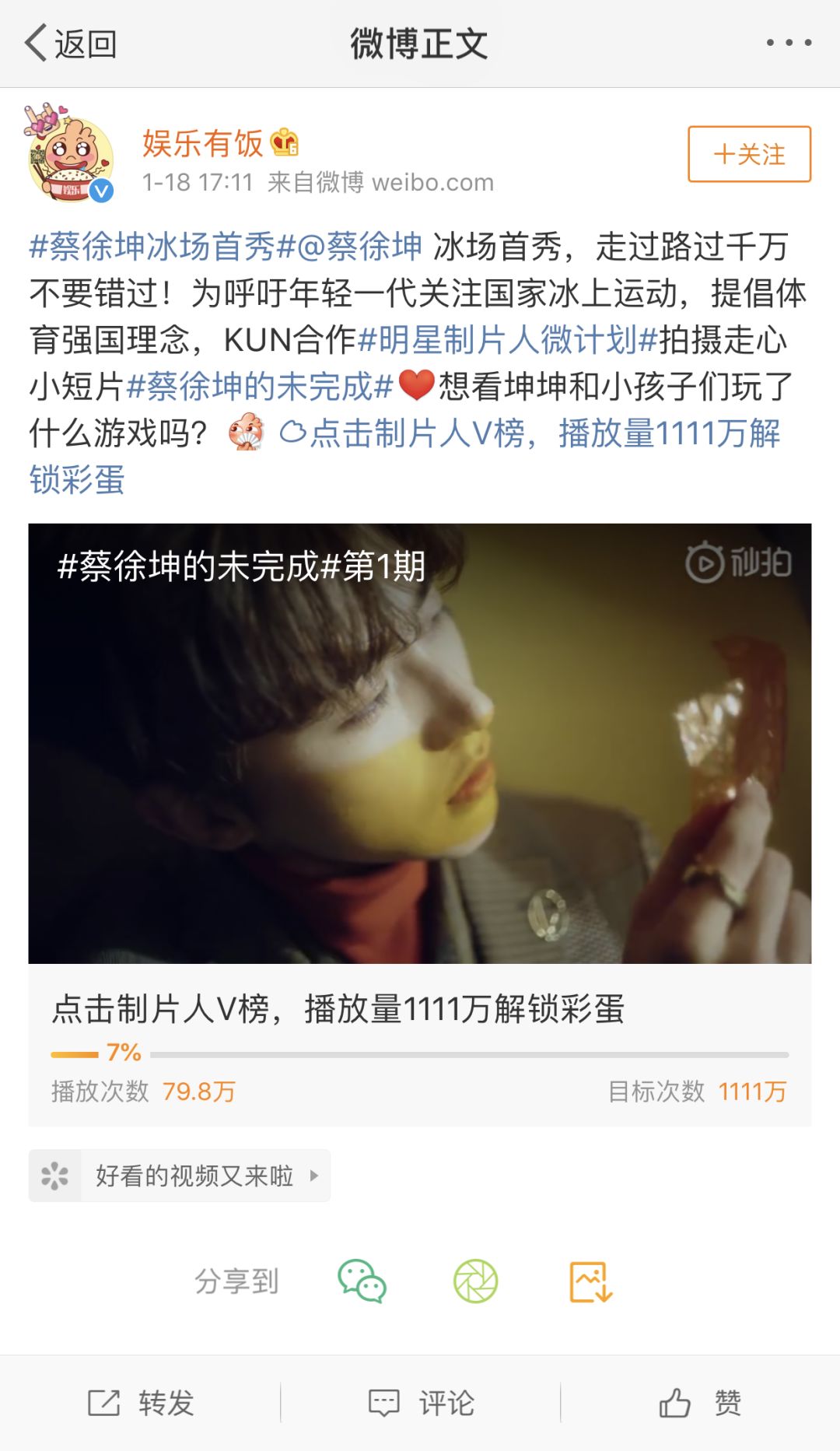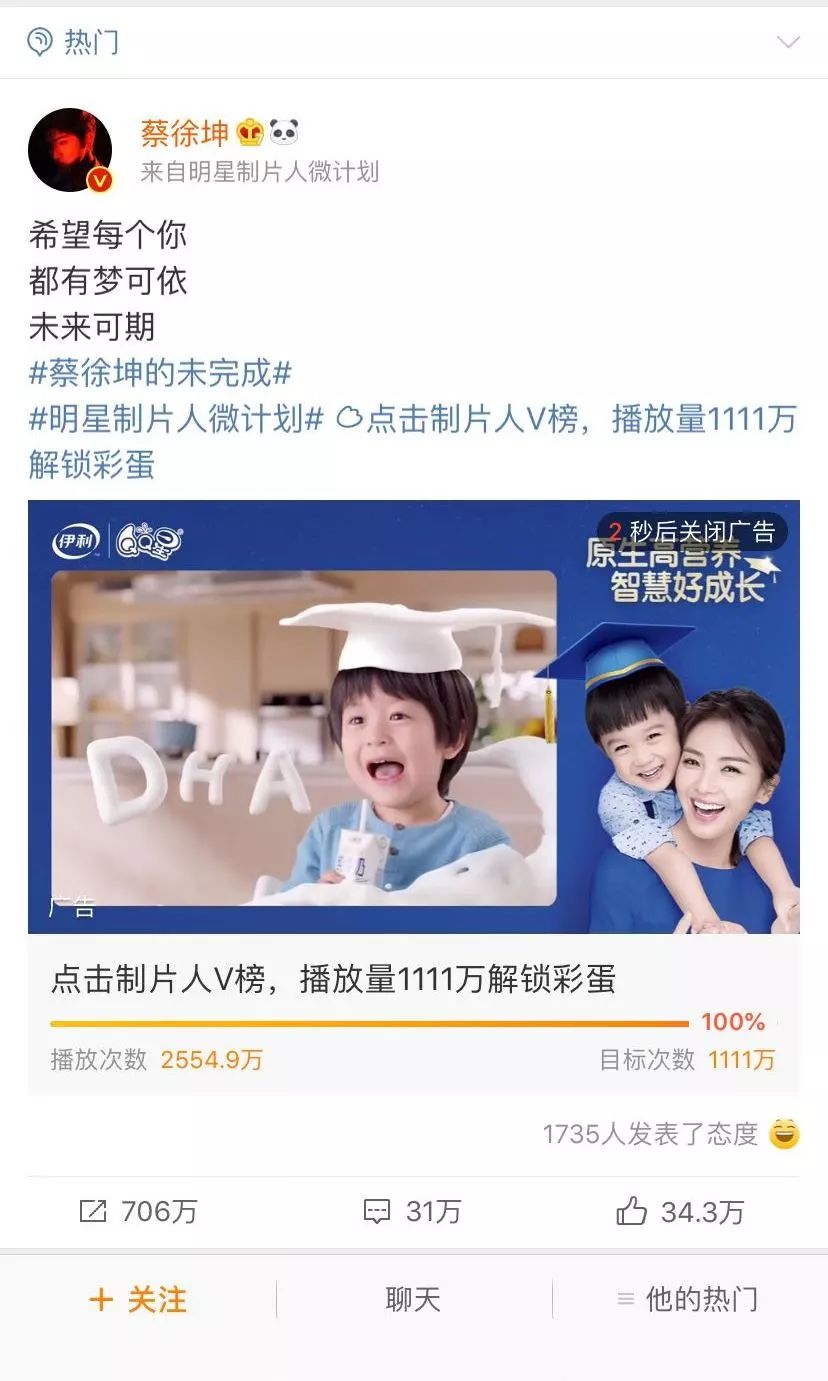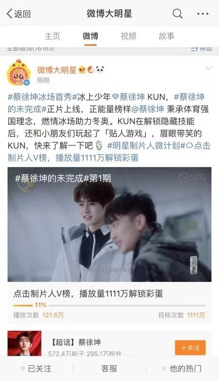 通过短视频高效传播品牌价值,深化品牌印象,少不了明星的助阵。凭借2018《偶像练习生》C位出道的冠军蔡徐坤,在微博拥有超高热度、超强流量、庞大的粉丝应援团,连续数月霸屏微博明星势力榜榜首。基于超高的人气,伊利邀请蔡徐坤出任活力冬奥学院#QQ星寒假第一课#的神秘嘉宾。由此,蔡徐坤联手微博独家打造个人成长微纪录片,《蔡徐坤的未完成》横空出世。