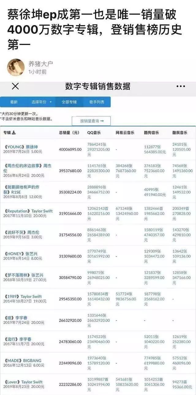 近日,蔡徐坤迎来了一个里程碑时刻,他的EP《YOUNG》成为史上第一张销量破4000万的数字专辑,登顶销售榜历史第一。被周杰伦甩在身后的,正好就是曾经抢了蔡徐坤微博超话第一的周杰伦,蔡徐坤算报仇了。