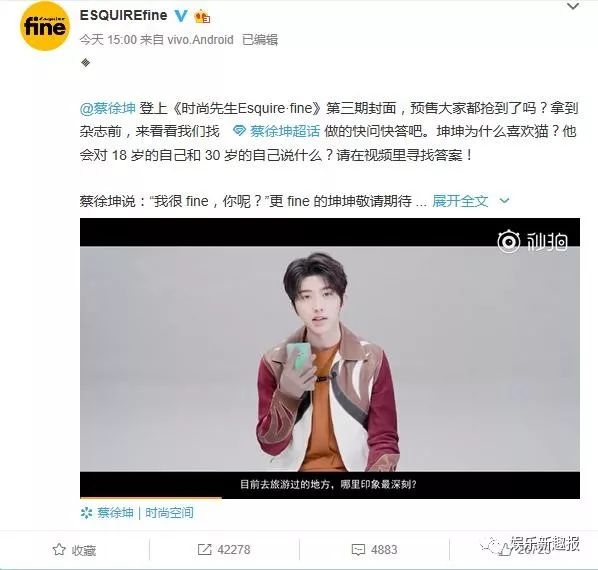 而回归休闲,活力四射的他也是帅的任性。在最新发布的《时尚先生fine》杂志蔡徐坤花絮视频快问快答中,一身着橘色T,搭上撞色外套的他,色彩搭配大胆,街头潮流范十足。