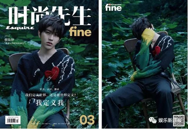 例如,近期在《时尚先生fine》秋季刊封面的穿搭,一身手工针织羊毛毛衣,绿色丛林中,似森林精灵诠释秋日浪漫,加上胸前红色心形胸针的巧妙点缀,灵气十足。