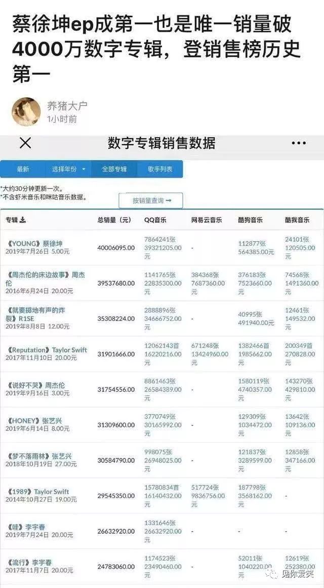 序言:近日,蔡徐坤迎來了一個里程碑時候,他的EP《YOUNG》成為史上第一張銷量破4000萬的數字專輯,登頂銷售榜歷史第一。被周杰倫甩在身后的,正好即是已經是搶了蔡徐坤微博超話第一的周杰倫,蔡徐坤算報仇了。