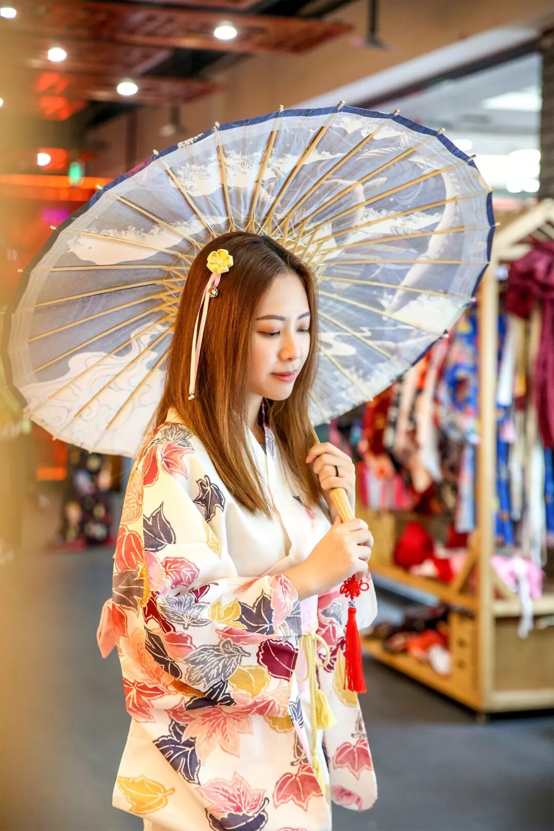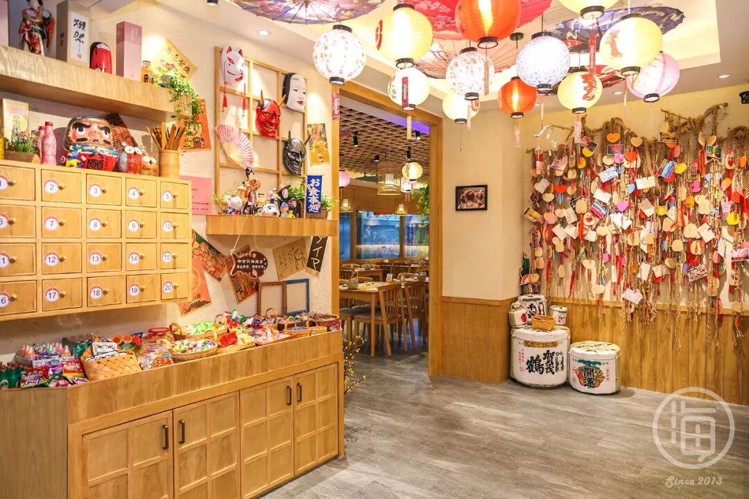 天花板上悬挂着日式纸伞、灯笼以及小贴画
