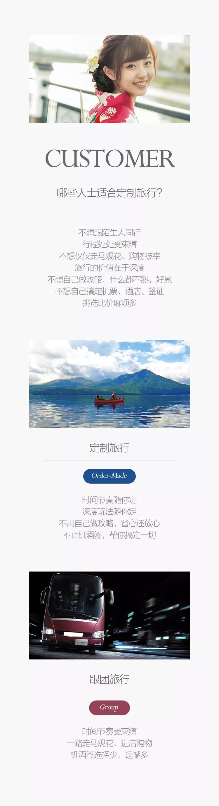 传统的东京,京都再加上富士山的走马观花式的大陆旅游团免费景点线路已经不再能满足中国游客的多层次多维度的旅行需求了。同样是来日本,凭什么人家就能比我玩得更好呢?