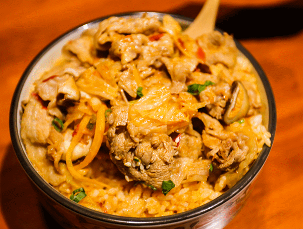 不仅有铺满整个碗面的多到要放不下的肥牛、还有放满一排的蒜蓉鸡肉,都充满了店家十足的诚意!在食用盖饭前,用勺子盛起店内特制酱汁浇灌在盖饭上,然后进行搅拌,那味道,难以忘怀!