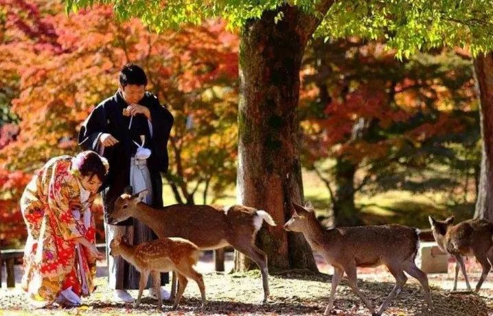 以小鹿闻名的奈良,却能让你被红叶震撼。阳光晴好的日子,红色的枫叶,黄色的银杏,还有仍然保留的翠绿的叶子,加上天空的湛蓝,色彩的冲击让人忍不住想用相机捕捉。穿过春日大社,一路往近铁奈良车站走,沿途很多风景,可以提前租好和服,拍下奈良红叶最美的关西记忆。