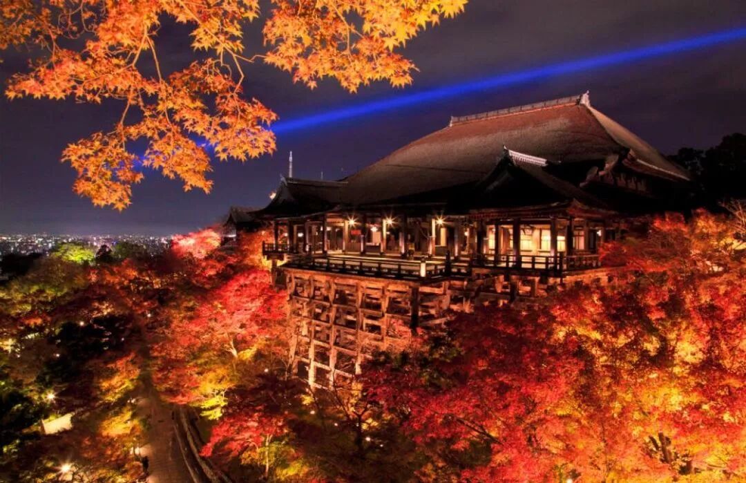 清水寺是京都最古老的寺院,被列为日本国宝建筑之一。清水寺的山号为音羽山,主要供奉千手观音。清水寺的红叶红得似火,烂漫似霞,阳光撒满叶面时的玲珑剔透,让人想到玛瑙的光泽和浸润。在云海上漂浮的天空之城是清水寺永恒的话题,而秋季的清水寺舞台如同漂浮在红叶之上。夜里,被红叶点亮的景色与白天的颜色完全不同,只有在这样知名的观景地才能享受这样的顶级景色。