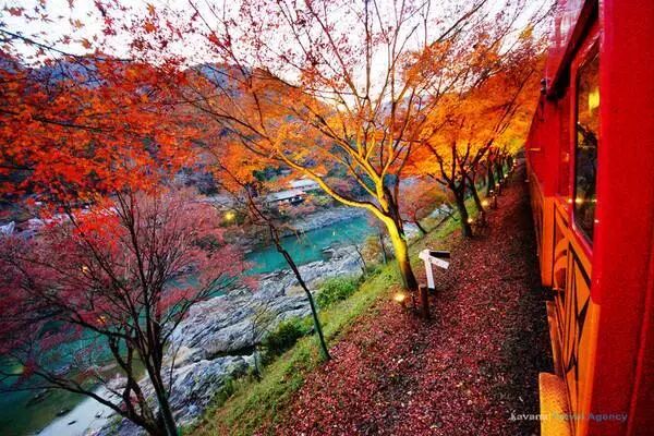 岚山小火车沿着保津川修建,运行在岚山地区的群山之间,一路上岚山地区的美景能够尽收眼底,岚山小火车的车票提前一个月就开始发售,但枫叶季的车票基本提前一周就售罄了。最有名的莫过于第5节车厢——露天车厢,可以零距离地接触岚山风景,岚山小火车的终点站是トロッコ亀岡,已经完全离开了岚山景区的范围,车站外是一片乡村田园风光。