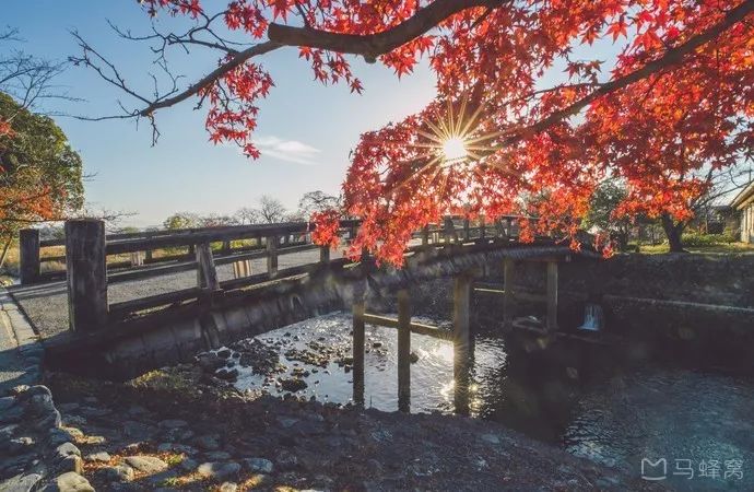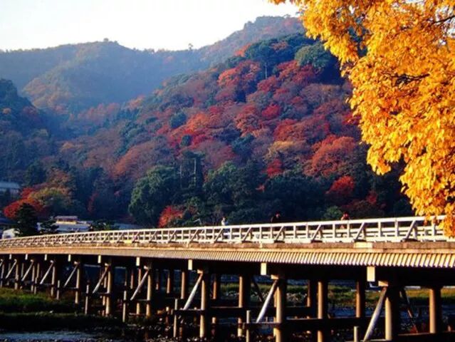 岚山渡月桥·横跨在京都岚山的大堰川上,全长155米,据说是空海的弟子道昌于日本平安时代初期的836年(日本承和三年)整修大堰川时所建。秋季时,在树叶陪衬下的渡月桥融入岚山景致,成为代表京都的明媚景色。