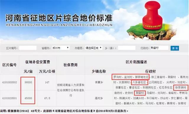 按照河南省的补偿标准,罗沟村、盘流村、郭家嘴社区、八卦庙社区、张立东村一亩补偿标准为9.8万元/亩,景寨村一亩补偿标准为4.5万元/亩。