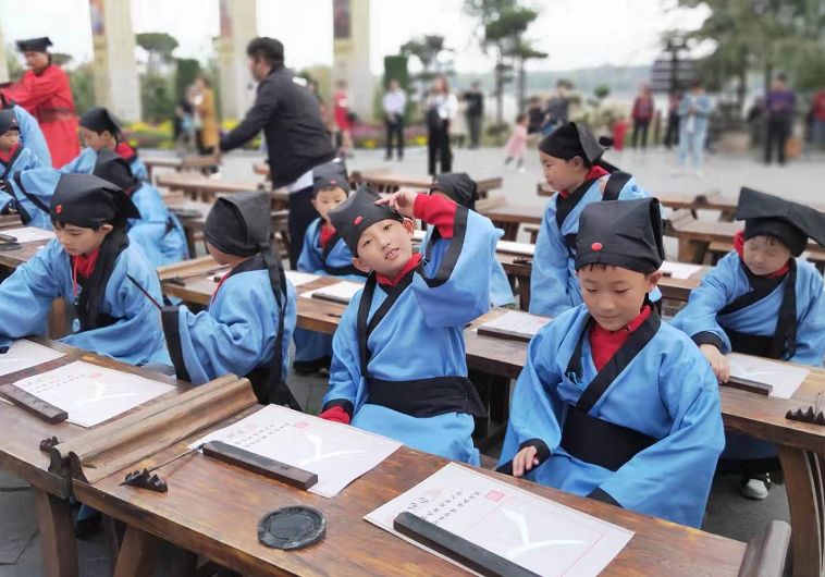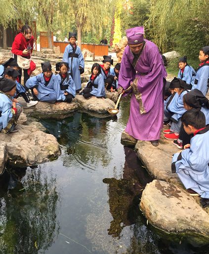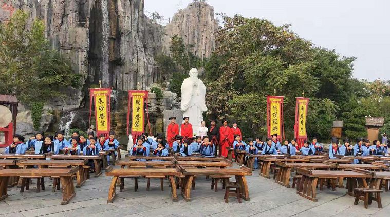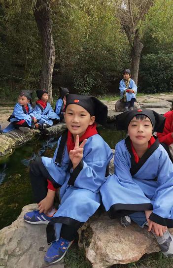 进园之初,孩子们在这里行了开笔礼:朱砂启智,开笔启蒙,传颂经典,击鼓明志。正衣冠、拜孔圣、明纪律、习礼仪,用实际行动向先贤致敬。
