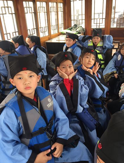 之后是轻松惬意的游画舫船环节,孩子们坐着古朴美丽的画舫船泛舟湖上,窗外微风拂过湖面,阵阵涟漪推着小船悠悠地前进,仿佛舍不得太快和孩子们分开。