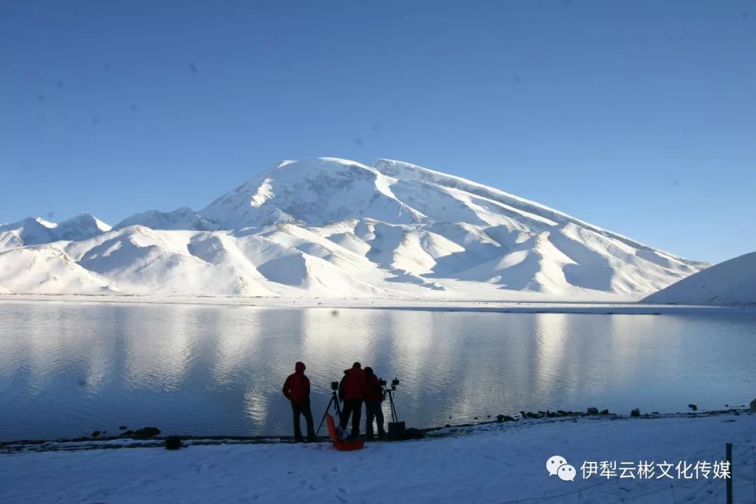 在湖边,倒影中的慕士塔格峰余晖被吸没在寒冷的冰湖中。
