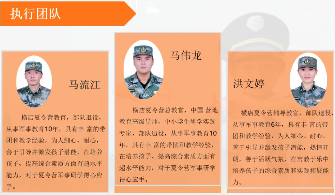 专业师资:所有教官均为10年以上专业军事培训人员,拥有丰富的带队经验夜间熄灯查房等服务;跟踪记录和反馈学员的个人基 本能力,纠正不良习惯,提高学员生活自理能力;