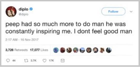 要想知道此人是不是跟风,你只要问他认不认识Lil Peep就行了,毕竟这两位年轻人在emo rapper里都是响当当的人物,可是让人难过的是,这两个十分优秀的年轻人也有着相似的命运:都在二十出头的年纪就离开了这个世界,R.I.P.