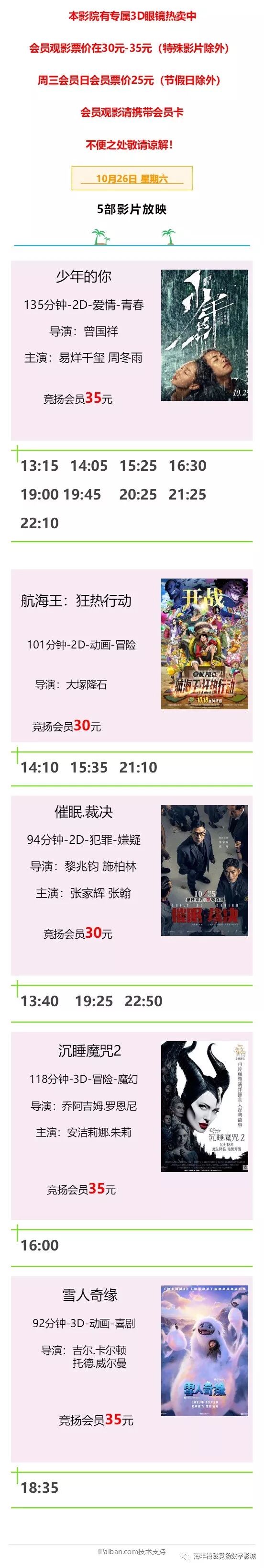 【2019年10月26日影讯】今日众多影片上映!票价全面下调,购票观影只需15元!