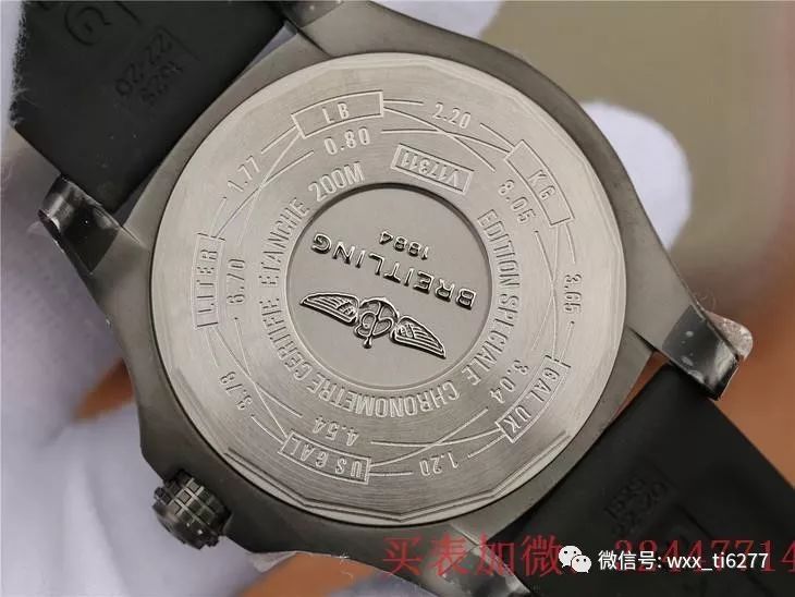 反面选用密底规划,钛合金底盖通过拉丝处理,呈现出哑光作用,镌刻着“BREITLING”的品牌标识以及英文参数。表壳后盖是拧入式后盖,上面刻着飞翔图,中心是一个磨砂logo,能够防水200米。