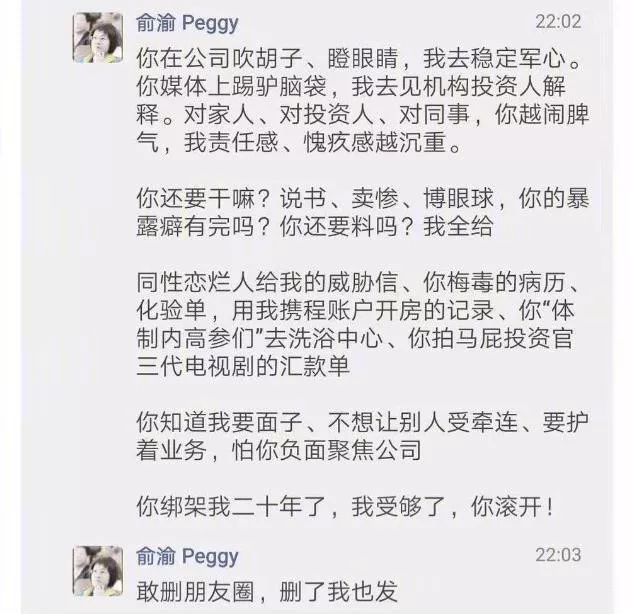 律师可怕吗?可怕,人家懂法,人家口才了得,但是律师没什么钱。律师和你死磕,也得花自己的钱。但是金融人士要是把你当敌人,人家可以花别人的钱。别人的钱就不是钱,拿来砸烂你的狗头就不可惜了。还有,搞金融的会算账,他们被招惹了,一时不发作,滴滴答答地计算着利息,一朝爆发,利滚利的降维打击谁也吃不消。所以,不要招惹搞金融的,不要招惹搞金融的,不要招惹搞金融的,重要的事情说三遍。俞渝是搞金融的,李国庆惹错人了。别看李国庆这么多年絮絮叨叨、张牙舞爪,好像声势颇足。俞渝一朝爆发,老少通杀,这才叫狠。相比之下,你李国庆摔个杯子,就是个小儿科。俞渝说的那些,随随便便找一条,都能砸掉一个瓷器厂。可是,夫妇之事,牵扯到老人就过头了。我能理解俞渝女士隐忍多年的压抑,但还是不能赞同这个爆发方式。我相信俞女士有很多委屈,李国庆也不缺“糟点”,但是这次甩给公众的信息量太大,太辣眼睛——关键是,这里面大半是隐私阴私的家务事,难以证实,清官难断。诉诸舆论,难不成媒体八卦专栏还能扮演法庭的职能?股权纷争也好,离婚官司也罢,最智慧的选择应该是诉诸法律,出门左转,总有适合你们两口子的法院。