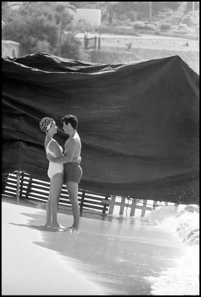 《夏日惊魂》片场,25岁的伊丽莎白·泰勒忽略海滩上的乞丐。她与凯瑟琳·赫本、蒙哥马利·克里夫特共同主演这部电影,这也是泰勒在第三任丈夫麦克·托德(Mike Todd)空难身亡后出演的第一步电影。托德去世几个月后,泰勒便与艾迪·费舍(Eddie Fisher)结婚,随后陷入丑闻。在接下来三十年间,她会逐渐熟悉这种处境,即便永远都不会感到愉快。