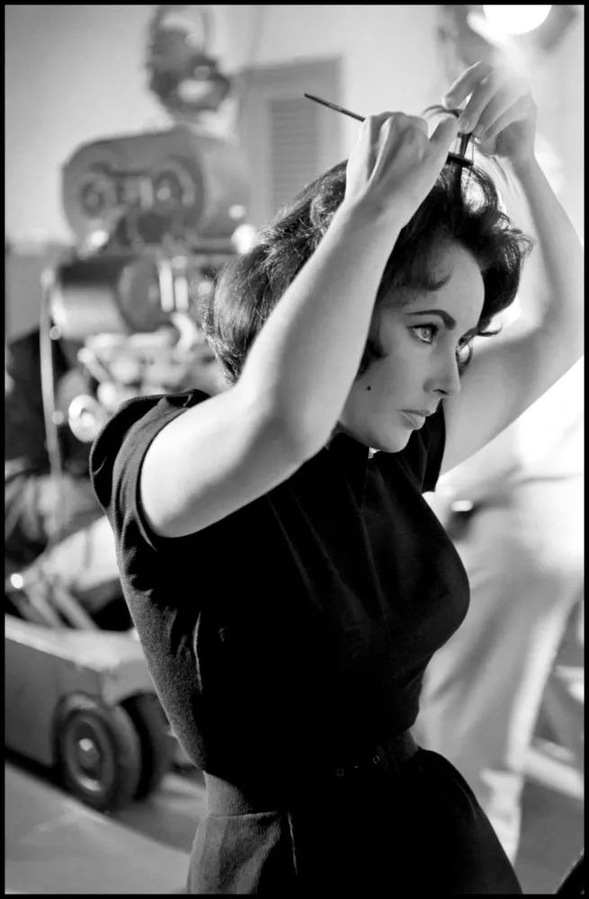 《夏日惊魂》片场,25岁的伊丽莎白·泰勒。她与凯瑟琳·赫本、蒙哥马利·克里夫特共同主演这部电影,这是泰勒在第三任丈夫麦克·托德(Mike Todd)空难身亡后出演的第一部电影。托德去世几个月后,泰勒便与艾迪·费舍(Eddie Fisher)结婚,随后陷入丑闻。在接下来三十年间,她会逐渐熟悉这种处境,即便永远都不会感到愉快。