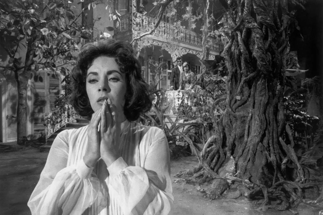 美国演员伊丽莎白·泰勒在《夏日惊魂》片场。