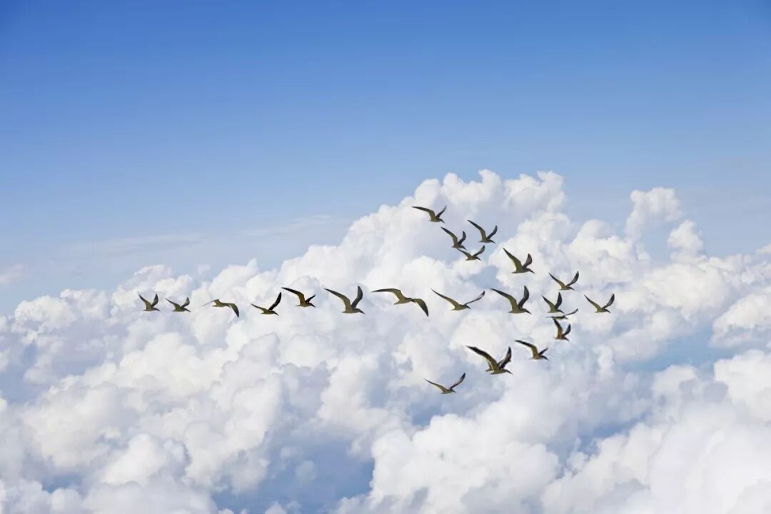 雁群飞翔,都会排成人字阵或一字斜阵,因为后面的大雁能借助前一只大雁羽翼产生的空气动力,在飞行时省力,飞一段时间后它们交换位置,使另一侧的羽翼也能借助空气动力缓解疲劳。孤雁飞起来很累,雁群飞起来就比较轻松。