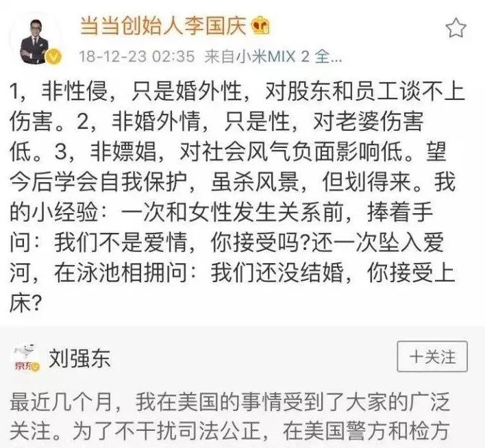 当时京东老板刘强东因为涉及性侵被捕,他却把自己的婚前性行为搬出来嘚瑟:“(婚外情)虽煞风景,但划得来。”