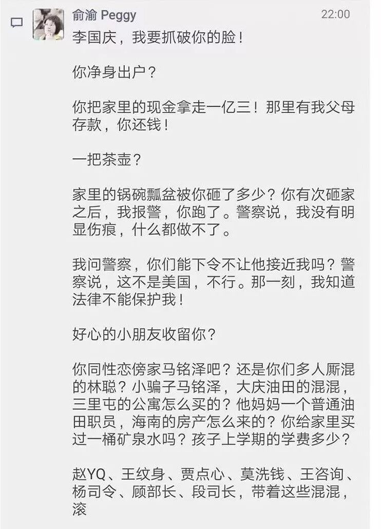 接着她细细罗列出李国庆私下生活的不堪,诉说自己和孩子的委屈,甚至连李国庆父母的隐私都曝光了出来。