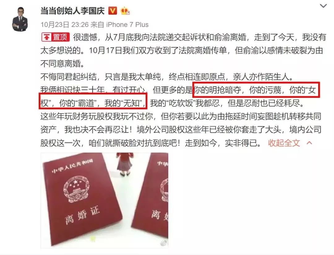 但这次,打下这些字的俞渝,不像是当当的掌门人,更像是一个被男人气疯掉的歇斯底里的女人。