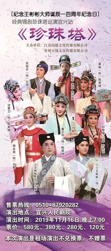 怀念王彬彬,重品彬彬腔,为纪念彬彬腔创始人王彬彬大师诞辰一百周年,两代锡剧领军巨头小王彬彬、周东亮将携彬彬腔第三代传人嫡孙小小王彬彬,锡剧王子爱徒汤达同台演出大型古装锡剧《珍珠塔》。同时,锡剧表演艺术家沈惠兰也将倾情加盟《珍珠塔》,为宜兴市民呈现一出星光熠熠、精彩纷呈的大戏!