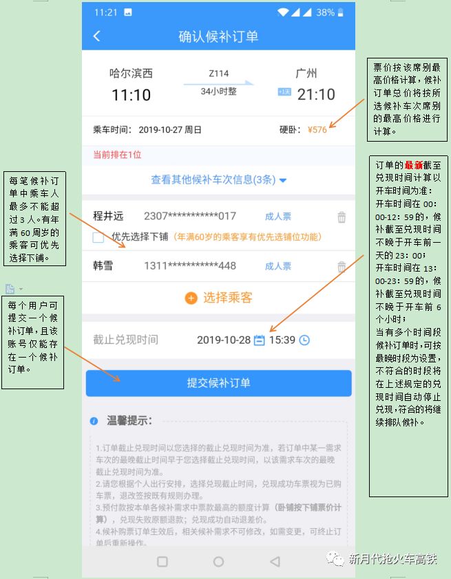 3.虽说每个账号只能提交一个候补订单,但候补订单和乘车人没有关系,可以通过新的账号继续候补其他车次席别。