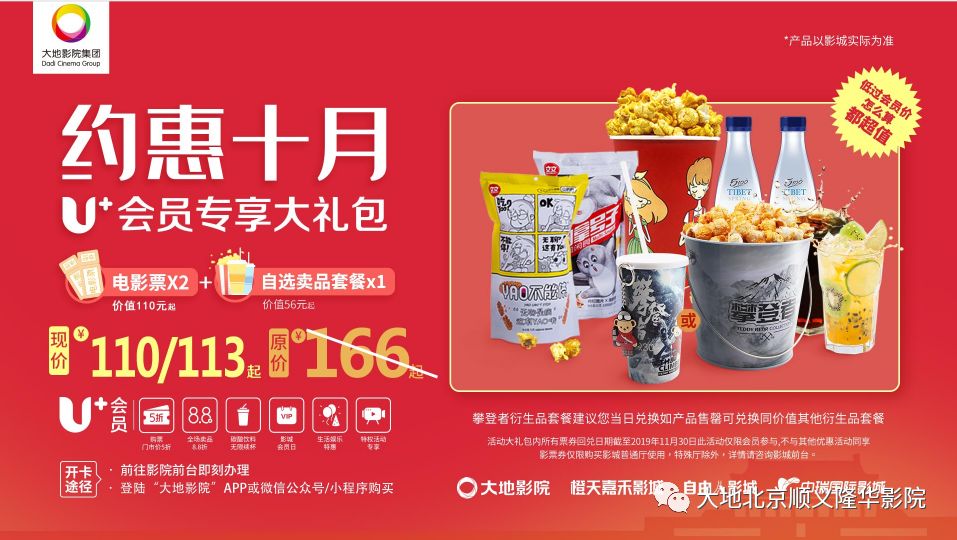 非会员yuan非会员:电影票×2+1中桶爆米花+2碳酸饮料+1休闲食品/造型杯=130元(购买此套餐加20元可办一年大地U+会员)