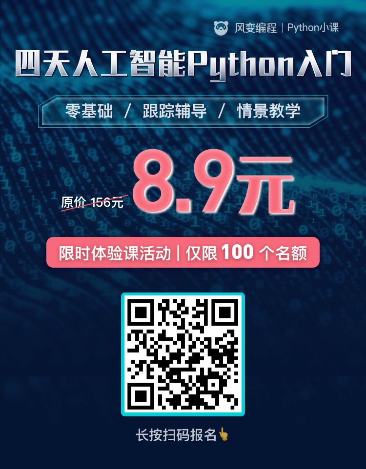 这次我与风变编程 | python小课合作推荐:四天人工智能Python入门体验课。我这次为大家争取到了100个限时优惠名额。想参加的小伙伴立刻抢购,先报先占位 !