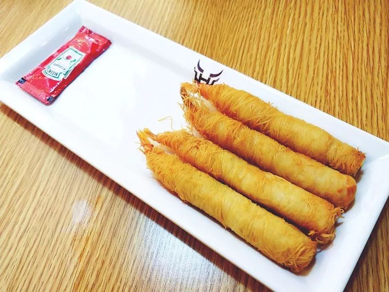 又称情侣虾,是非常有创意的一道菜。鲜嫩的大虾,包裹春卷丝,寓意情侣之间相爱,缠绵悱恻,情愫如千丝万缕,剪不断,理还乱。